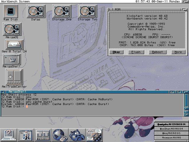 A Workbench, azaz az Amiga kezelofeluletenek About ablaka. Alul egy nyitott parancssor, ahol eppen menet kozben allitgatom a CPU cache beallitasait.