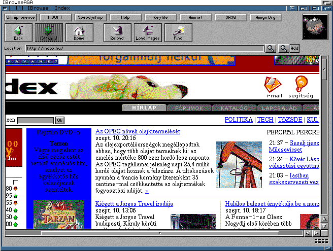 IBrowse 2.2. Az egyik legjobb Amigas webbongeszoprogramban nezegetem az index.hu-t, 32 szinben.