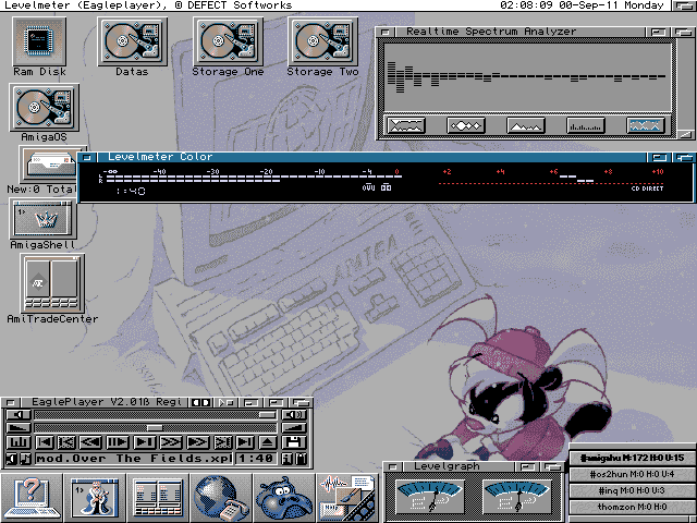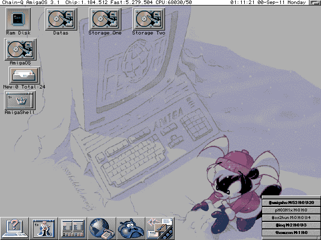 A Workbenchem uresen. Felul a driveok ikonjai, fuggolegesen az ikonizalt futo programokei. A jobb also ablakban az AmIRC csatornastatus ablaka. Legalul a Toolmanager, amelynek az ikonjaira kattintva menuk nyilnak, ahonnan kozvetlenul elerhetok a kategoriakba sorolt programok.