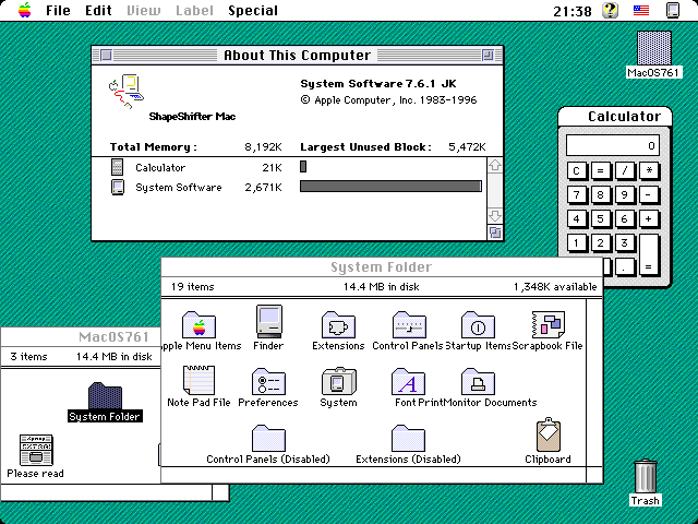 Apple MacOS 7.6.1. Nos igen, az Amigakon fut a nagy MacOS is. Megpedig nem is akarhogy, hanem a kicsi lenezett AmigaOS egyik taszkjakent... Ez mar onmagaban eleg sokat elmond, a kepeken is jol megfigyelheto a kvalitasbeli kulonbseg a 256 szinu MacOS, es a 32 szinben futo AmigaOS kozott... Es meg kerdik, hogy az Amigasok miert nem valtanak Macre, ha mar nem akarnak PC-t hasznalni... :) Azt, hogy tenyleg Amigan fut a MacOS, az "About This Computer" ablakban levo "ShapeShifter Mac" felirat tanusitja. A ShapeShifter az egyik Amigas Mac emulator. Egyebkent fut belole a legtobb Mac-es program, ugymint Internet Explorer, Netscape, M$-Word, stb, megsem hasznalja szinte senki Amigan... Ez megint csak eleg sokat elmond... ;)
