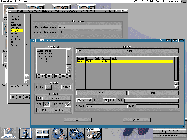 Miami Deluxe. Bar a fentiekbol talan kiderult, hogy az Amiga eleg jol hasznalhato halozatos klienskent, itt nem er veget a dolog, a gep ugyanis szerverkent is mukodik, megpedig nem is rosszul. Az egyik, TCP/IP halozatot kezelo programbol most a tuzfalakat es az IP-NAT-ot beallito ablak lathato...